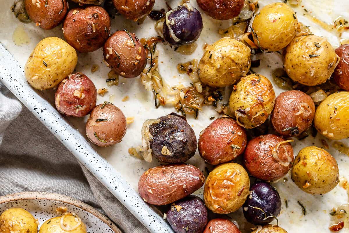 - Small potatoes – also called new potatoes, baby potatoes, or marble potatoes. We used a variety of these in red, purple, and yellow. We loved how pretty they looked! They are thin-skinned with a crisp, waxy textured flesh that holds well when baked.