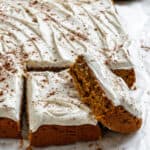 This vegan pumpkin sheet cake will be a new favorite for the season. Not only is it perfectly fluffy, soft, and super moist (thank you, pumpkin), but it’s loaded with cozy fall flavors like pumpkin spice, cinnamon, and brown sugar, topped with a decadent sweet and tangy vegan cream cheese frosting. Children, adults, vegans, and non-vegans alike will love this one.
